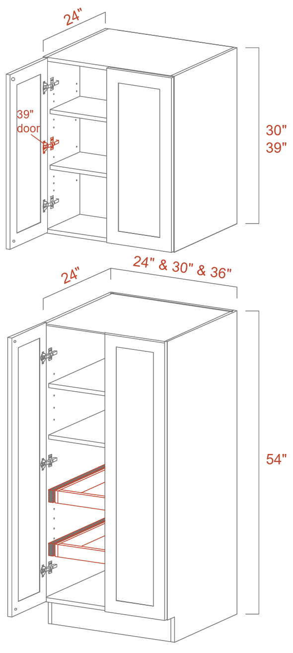 A tall pantry cabinet can be divided into one LOWER & one UPPER unit. The lower unit is the pantry base cabinet and the upper unit is the 24″ deep wall cabinet. Refer to LOWER, UPPER for available models.